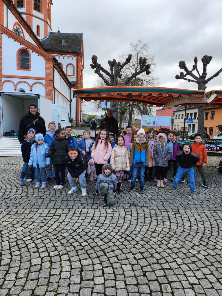 Im Rahmen unseres Sachunterrichtsthemas „Gesunde Ernährung“ besuchte die Klasse 1c am 26.3. den Sinziger Wochenmarkt. Ziel des Ausflugs war es, den Kindern frische Lebensmittel näherzubringen und ihnen zu zeigen, wo Obst und Gemüse herkommen. Bei kaltem Wetter machten wir uns gemeinsam, begleitet von einer Mutter, auf den Weg zum Markt auf dem Kirchplatz in Sinzig. Dort wurden wir von einem Standbesitzer sehr freundlich empfangen.