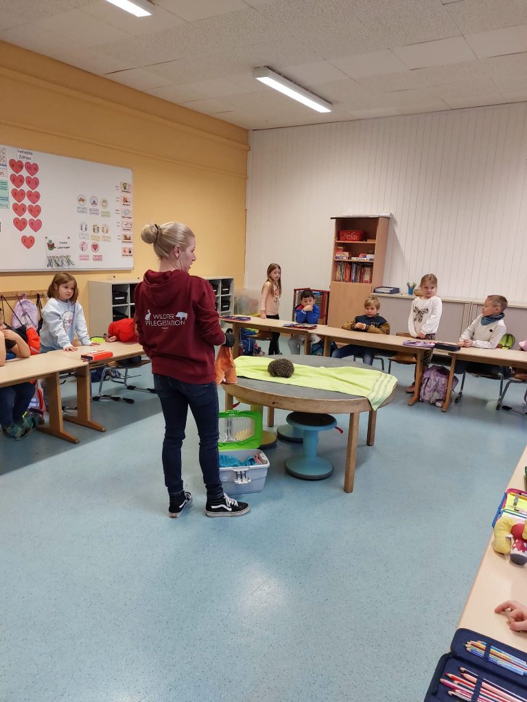 Ein ganz besonderes Highlight war der echte Igel, den die Pflegerin mitgebracht hatte. Mutig und fasziniert konnten die Kinder das Tier aus nächster Nähe beobachten – ein Erlebnis, das sicher noch lange in Erinnerung bleiben wird.