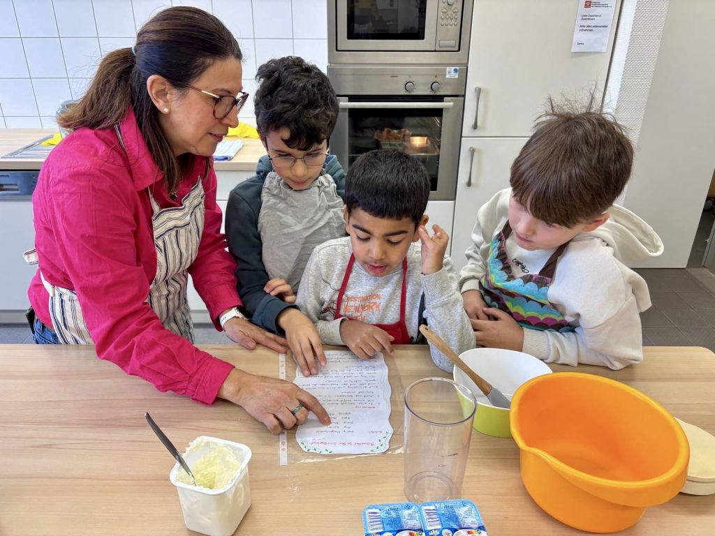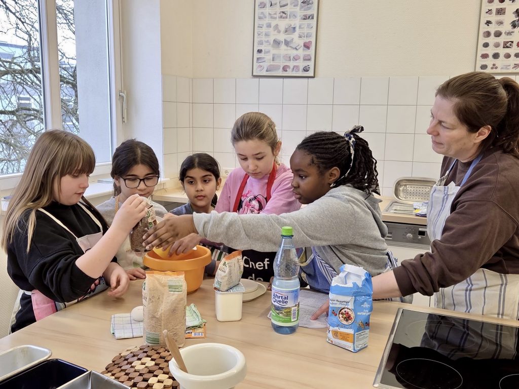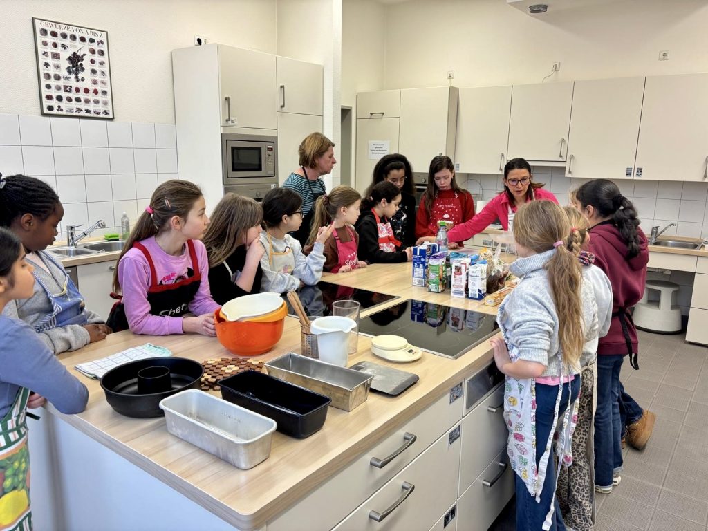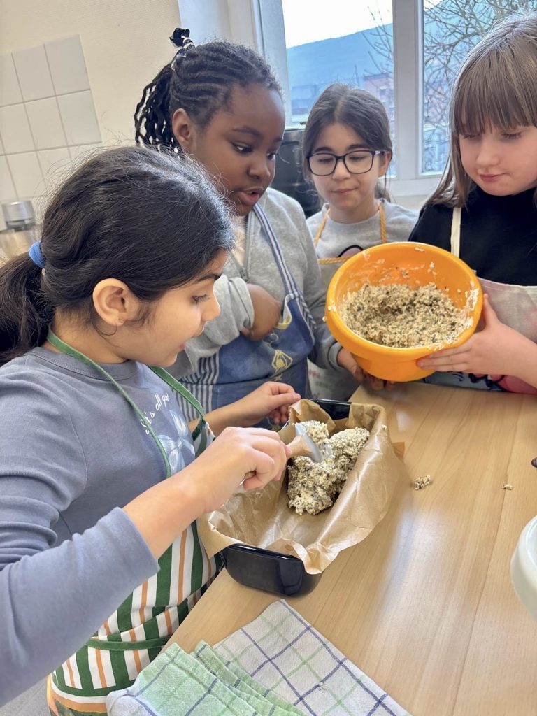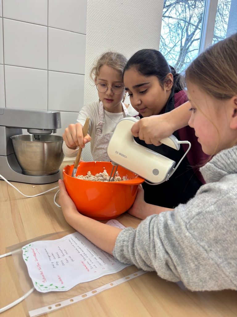 Es wurden die Rezepte sowie deren Zubereitung in den Gruppen eifrig gelesen, die einzelnen „Posten“ untereinander verteilt, Zutaten gewogen, zusammen gerührt und der fertige Teig in die Formen gegeben.